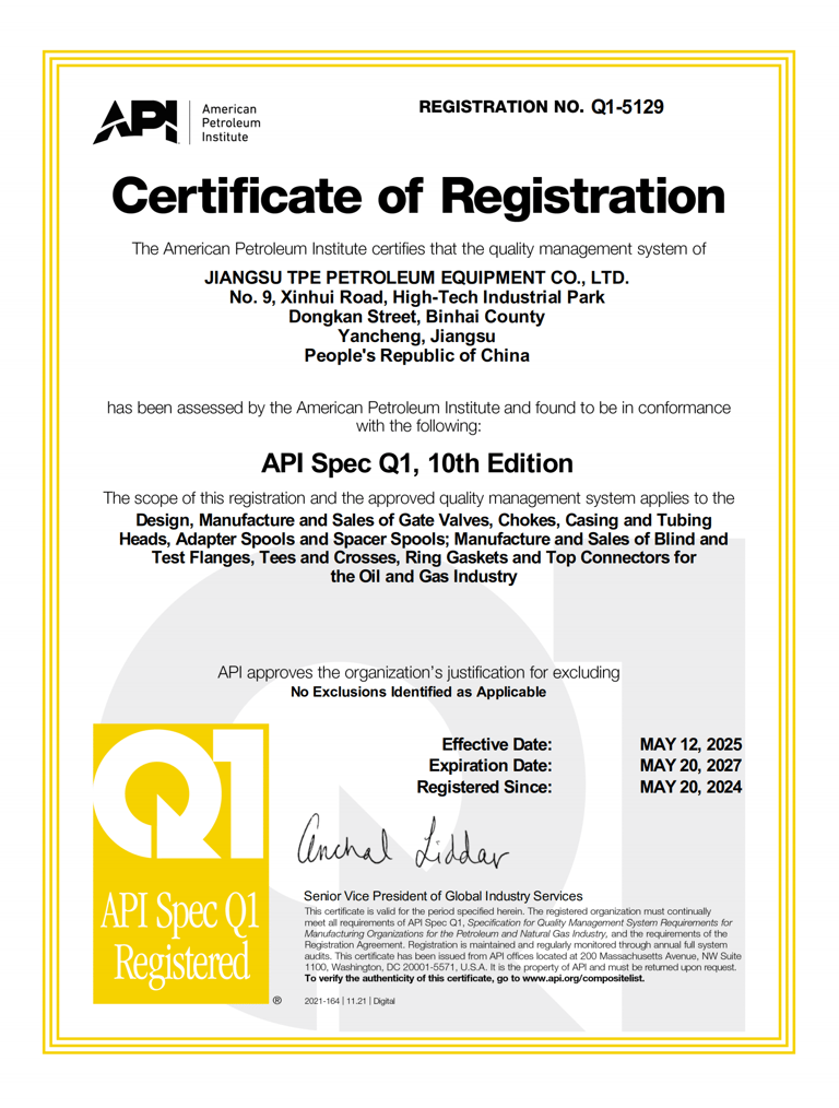 All BOT's product families have been API 6A certified. We specialize in TPE products that include various high-pressure oil & gas wellhead equipment and parts:
